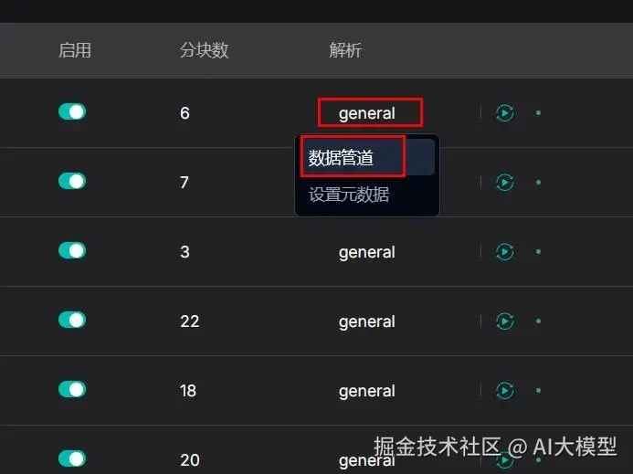 | 检索不到检测报表数据 | Excel文件用了General模板,表格结构被拆分 | 1. 查看分块记录(文件→Chunk页面);2. 确认模板类型(配置→分块设置) | 1. 删除原分块(批量操作→删除分块);2. 重新上传并选择Table模板 |