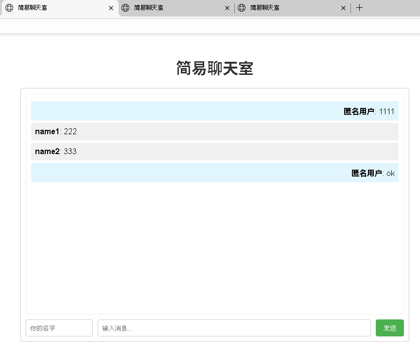 index.html文件(可在多个浏览器窗口/标签页中打开,模拟多用户聊天) -