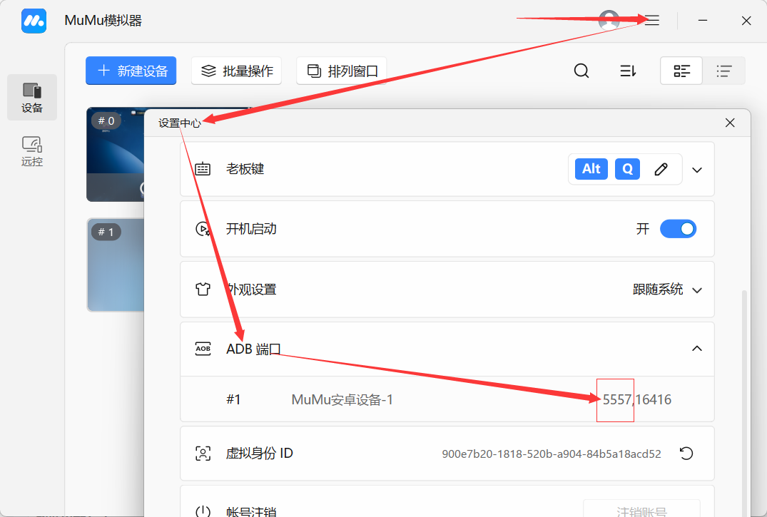 **查看 MuMu 模拟器的 ADB 端口号:**在主界面菜单中选择设置中心,进行查看