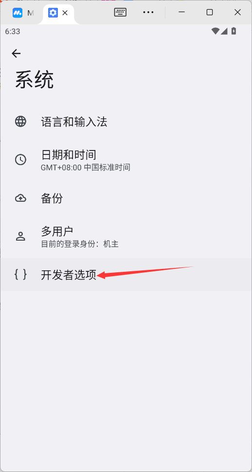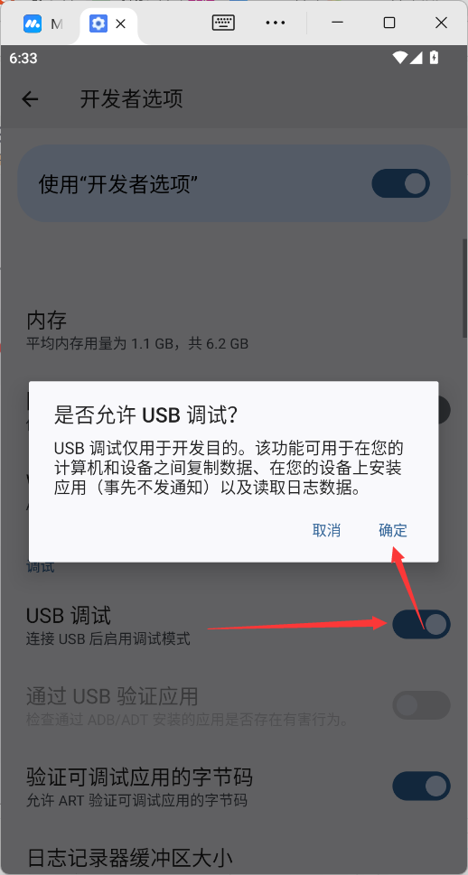 同真机设置类似,手机模拟器开启开发者选项与 USB 调试。
