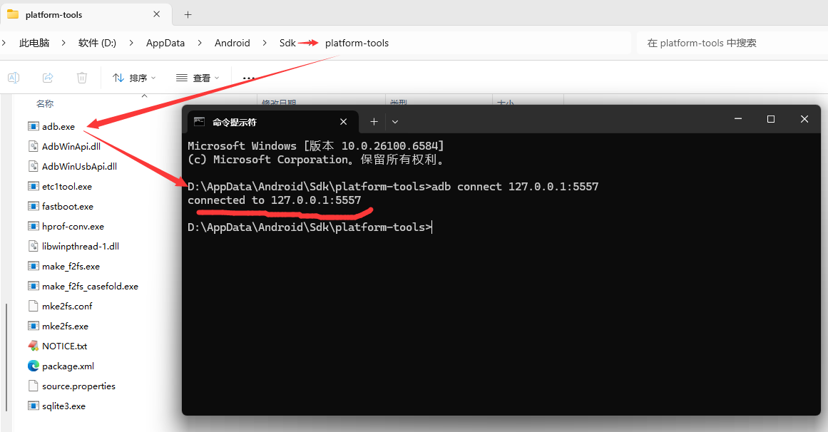 Android SDK 的 platform-tools,其中包含 adb.exe,启动 命令提示符 (CMD) 或 PowerShell,执行链接命令,命令格式如下: