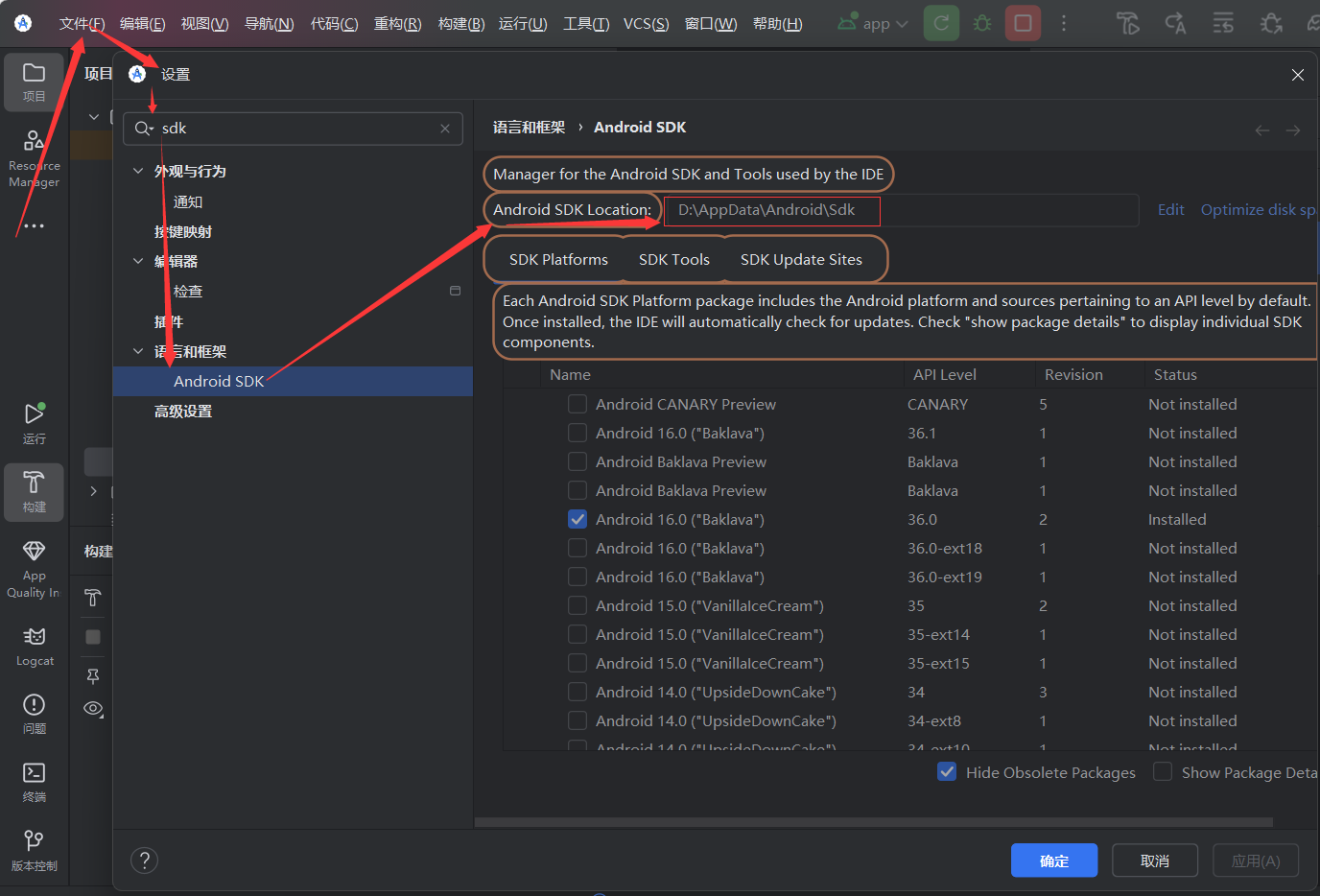 在 Android Studio 的 File -> Project Structure -> SDK 中查看 Android SDK 的安装路径: