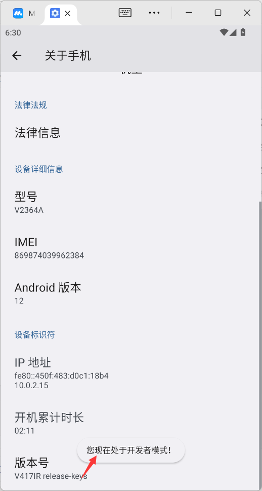 连续点击 版本号 多次(通常7次左右),直到出现提示,表明 开发者模式 已开启