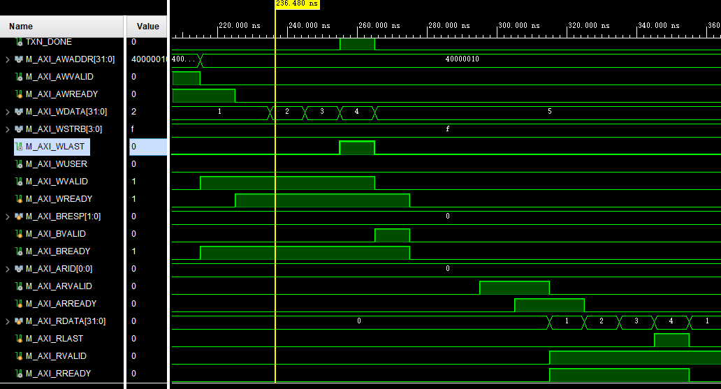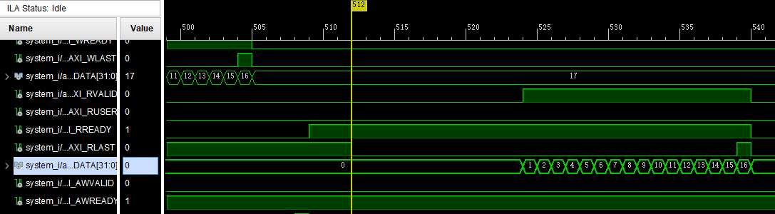 可以看到这里RLAST在默认情况下竟然是被拉高的情况,这里我调试了好久发现了这个问题,最终将AXI代码中的读通道不仅仅依靠RLAST变化才让功能正确,其问题出现在自动连线时生成的axi interconnect的ip核逻辑