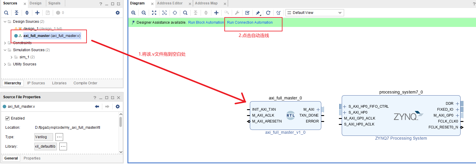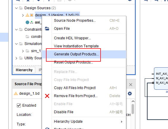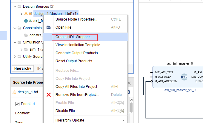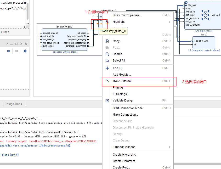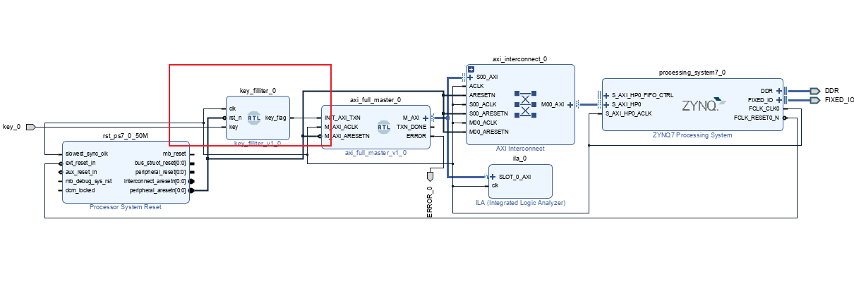 再创建一个按键消抖模块作为启动信号,创建好代码后拖到空白处,然后连接INIT_AXI_TXN