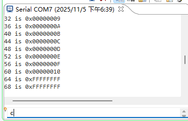再次向串口输出c,可以看到地址被写入数据,写了16个32位数据
