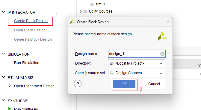 创建一个新项目后左侧点击Create Block Design,然后点OK