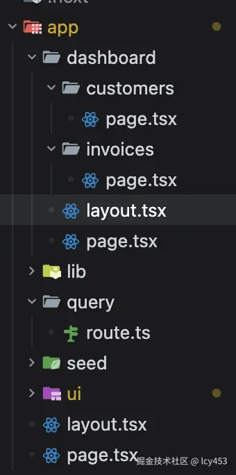 比如当我们的目录结构是这样,那么当我们切换到dashboard目录就会自动跳转到layout组件,其他的文件夹customers和invoices(包含page文件)会自动嵌套layout子路由。路径为文件名称,page.tsx是页面入口。