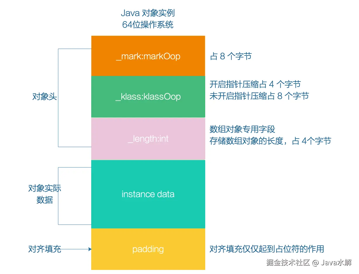 - Java 对象的大小默认是按照 8 字节对齐,也就是说 Java 对象的大小必须是 8 字节的倍数。若是算到最后不够 8 字节的话,那么就会进行对齐填充。