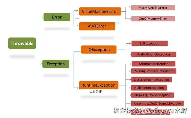 - 第一种是我们开发人员会经常遇到的Throwable的子类Exception中的异常。并且这种异常一般是运行时异常和IO异常,表示程序还能够克服和恢复的问题,运行时异常就是我们开发中实际会经常遇到的一些,比如java.lang.NullPointerException、java.lang.ClassNotFoundException、java.lang.IndexOutOfBoundsException,这种异常可以使用try catch进行捕获异常就可以了,当然我们还可以提前用throws把有可能发生的异常给声明出来,或者在进行局部可能会出现的异常进行throw出去(这个只能单独抛出一种异常的实例)