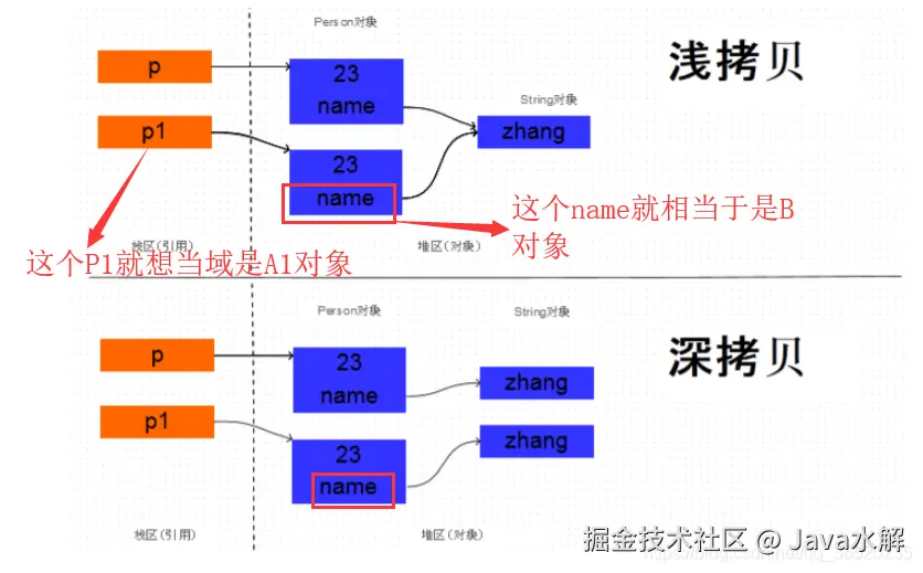 - 当如果要拷贝一个A对象,而A对象中又有一个B对象,那么如果对A拷贝的时候,重新拷贝出来一个A1对象并且重新分配内存地址,但是对于A中的B对象,仅仅只是把A1中拷贝出来的B1对象的引用指向原来的B对象而已,并没有把拷贝的B1对象也重新进行分配一个新的内存地址。这就是浅拷贝。