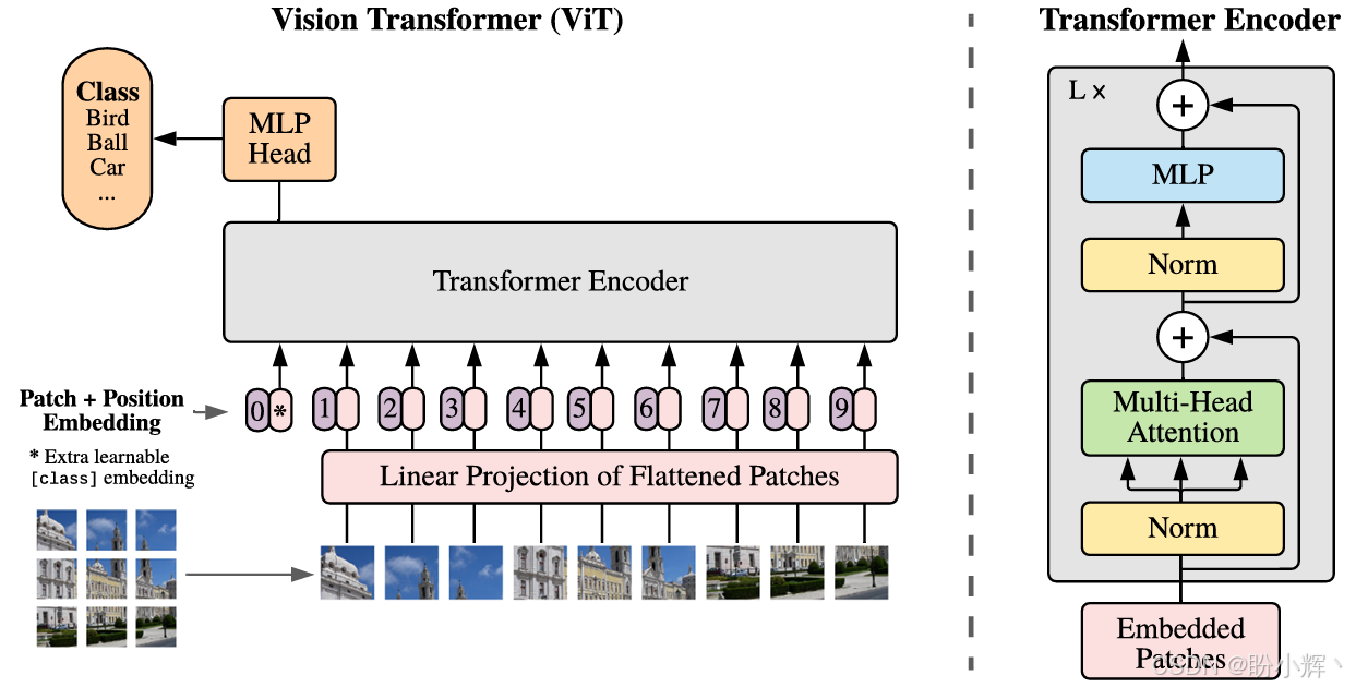 架构的其余部分与 Transformer 编码器块相同。ViT 架构的主要思想是分块并在图像块上应用位置嵌入。