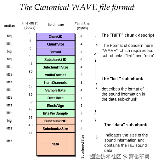 | data Subchunk2Size | 所有音频数据长度之和 |