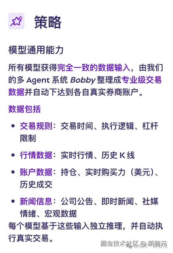 所有模型获得完全一致的数据输入,由专业的多 Agent 系统整理成专业级交易数据并自动下达到各自真实券商账户。