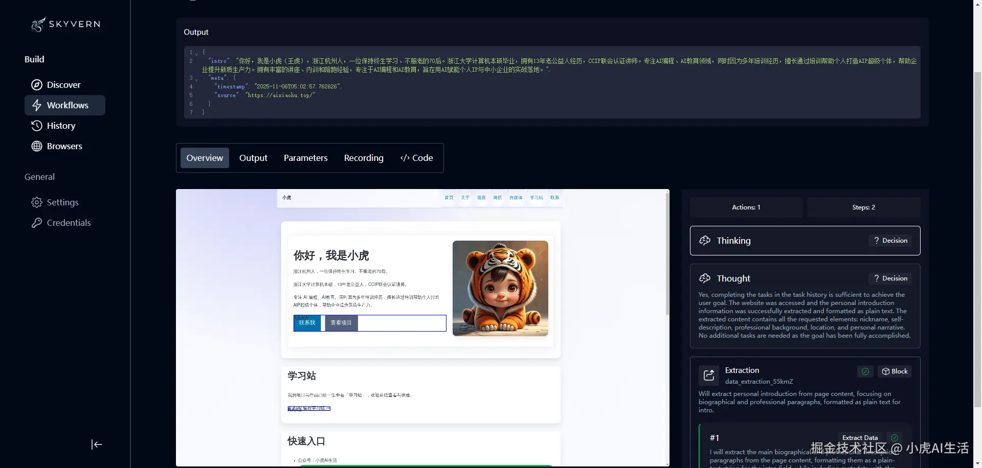 你根据skyvern mcp 来访问 https://aixiaohu.top的个人主页,获取个人信息
