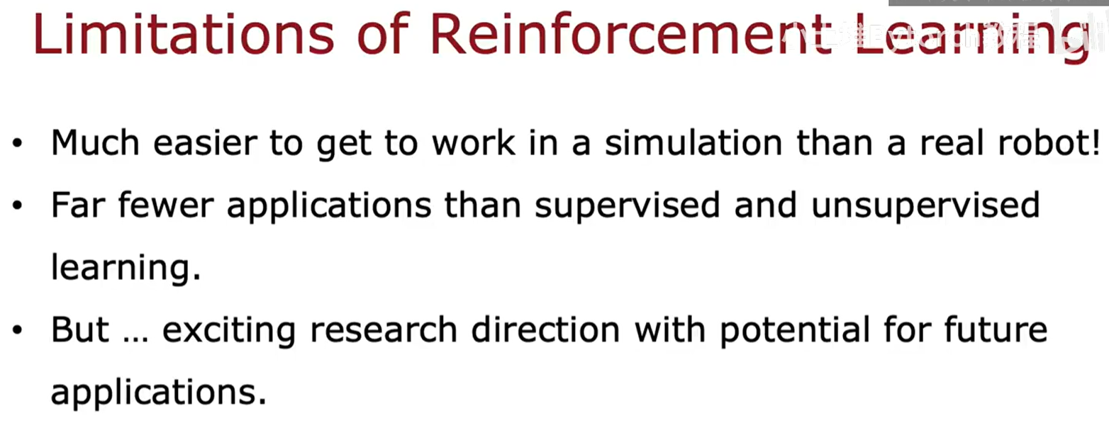 - 应用范围相对较窄:目前,强化学习在工业界成功部署的应用数量,远少于监督学习和无监督学习。它通常需要大量的交互数据(有时是数百万次尝试),并且对环境建模和奖励函数设计非常敏感。