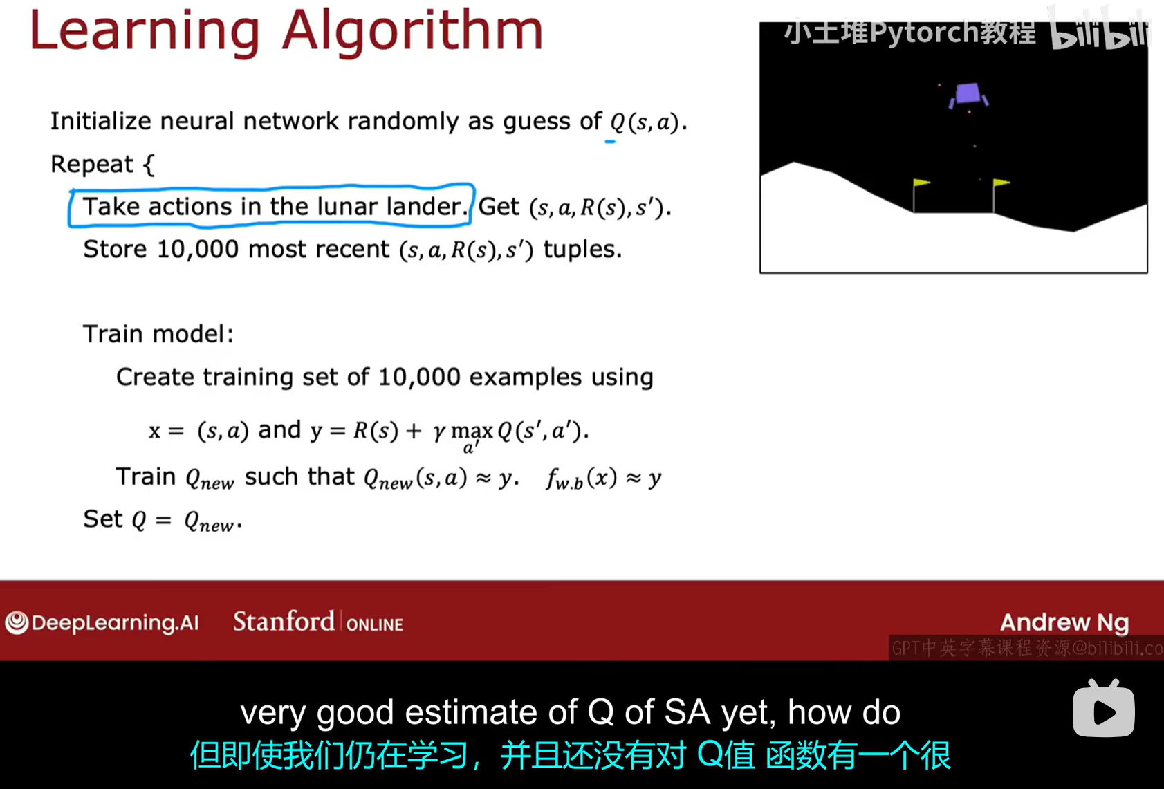 收集数据 :首先,让智能体与环境(月球登陆器)进行交互,收集大量的经验元组(experience tuples)