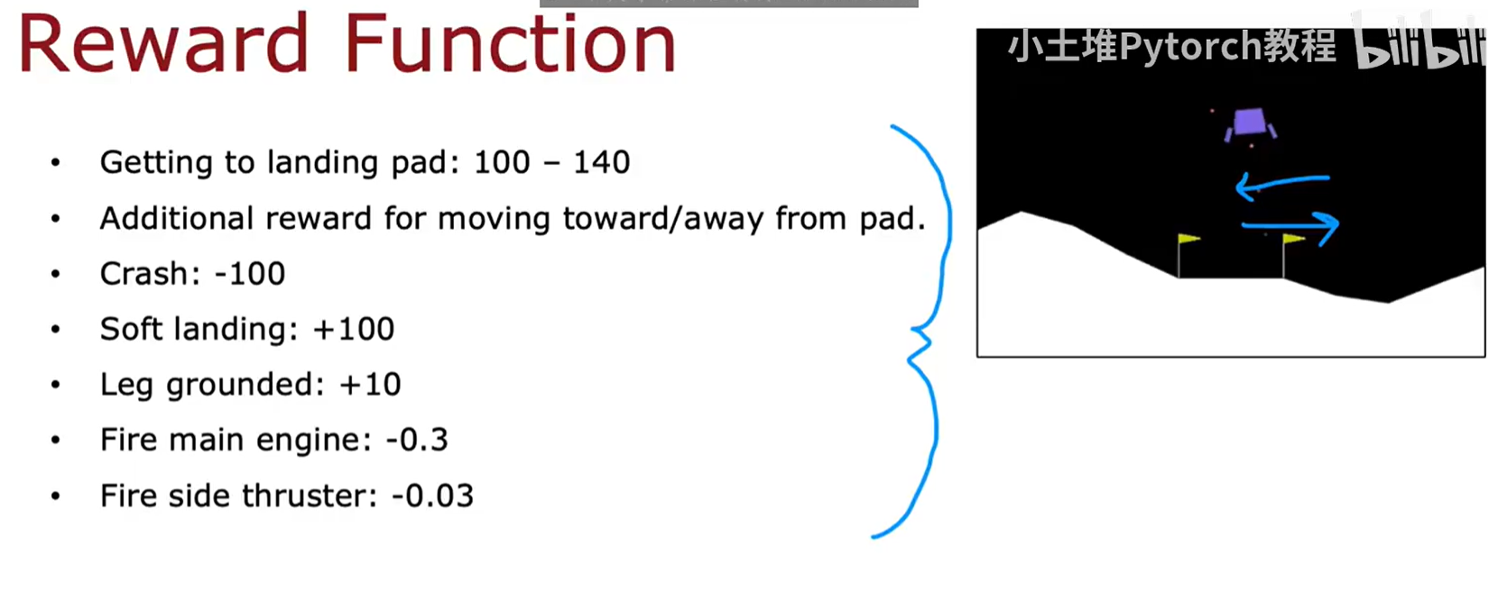 +10分。 - 燃料惩罚 : 为了鼓励智能体节省燃料,每次使用推进器都会受到惩罚。使用主推进器惩罚