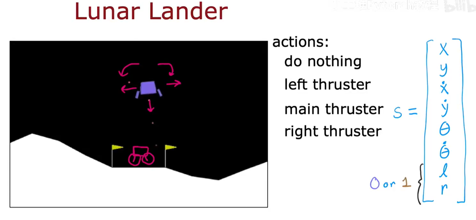 a是一个离散的量(4种可能),我们可以使用**独热编码(one-hot encoding)**将其转换为一个4维的二元向量。例如,[0, 1, 0, 0]代表"启动左侧推进器"。 - 拼接后,输入向量