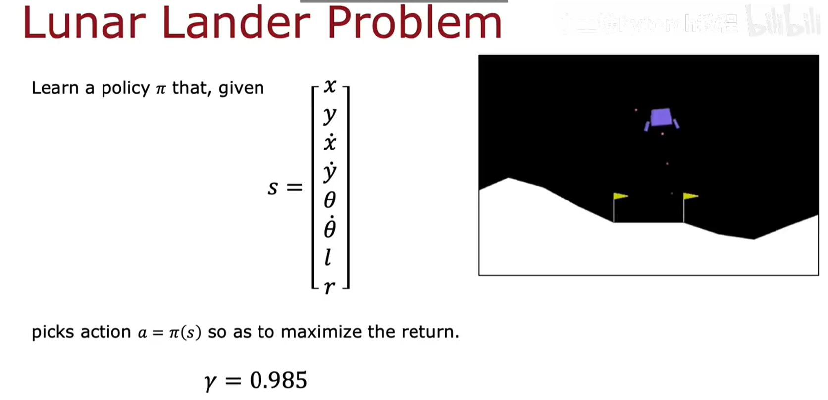 我们的最终目标是学习一个策略 π。这个策略接收当前8维的状态向量s作为输入,然后输出一个最合适的行动a = π(s)。选择这个行动的依据是,它能够最大化未来的累积折扣回报(Return) 。在这个问题中,折扣因子 γ 被设定为一个较高的值,如 0.985。这表明智能体需要具备"远见",它必须权衡短期内的燃料消耗和姿态调整,以实现最终安全着陆的长期目标。