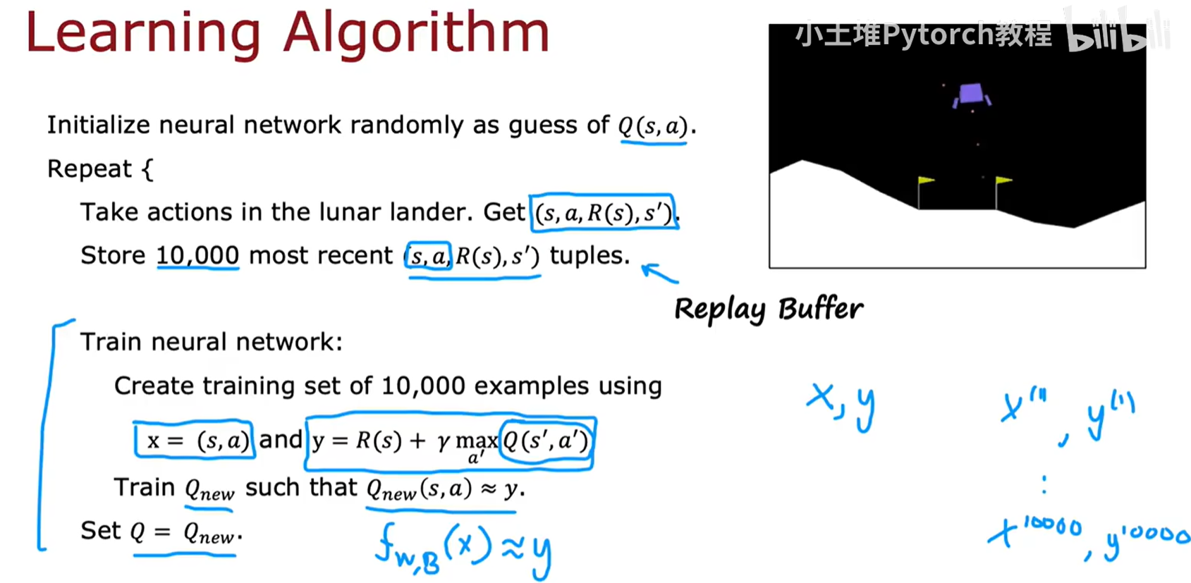 y值是根据贝尔曼方程计算出的"目标Q值",我们希望我们的网络对输入x的预测能够逼近这个y。 R(s')和s'这两个值直接从我们收集的经验元组中获得。max_a' Q(s', a')这一项,需要用我们当前 的神经网络,来计算新状态s'下所有可能行动a'的Q值,然后取其中的最大值。