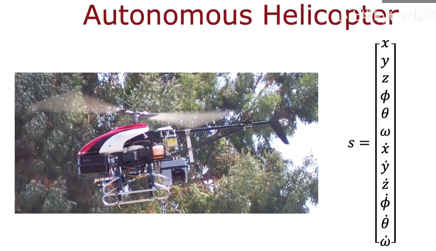 - 自动驾驶直升机案例 :这是一个典型的、高维度的连续状态空间问题。要完全描述直升机的飞行状态