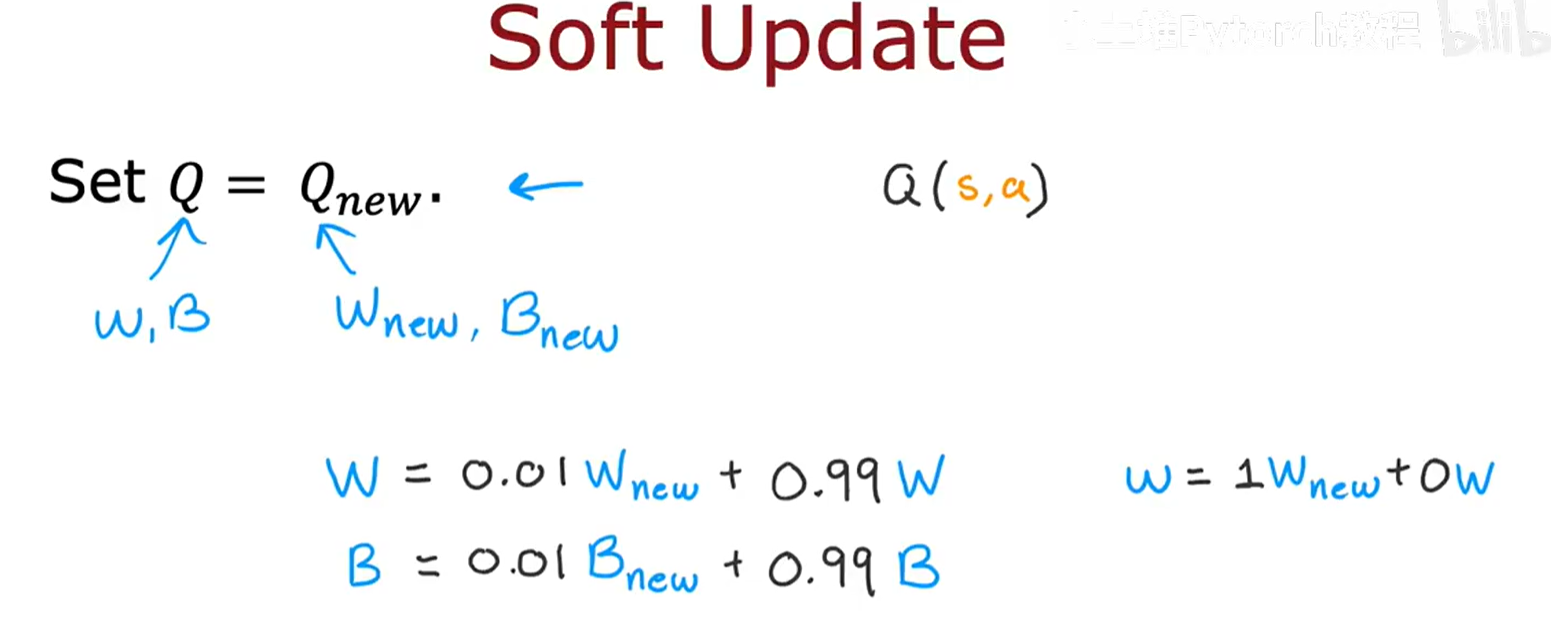 在DQN算法流程的第3.d步,我们提到"更新Q网络"。一个朴素的想法是,每训练完一个mini-batch,就将训练得到的新网络 Q_new 的参数 W_new, B_new,直接、完整地复制给主网络 Q(Set Q = Q_new)。这种"硬更新"有时会导致训练过程不稳定,因为目标y值的计算依赖于Q网络本身,当Q网络频繁剧烈变动时,目标y也会剧烈摆动,使得学习过程难以收敛。