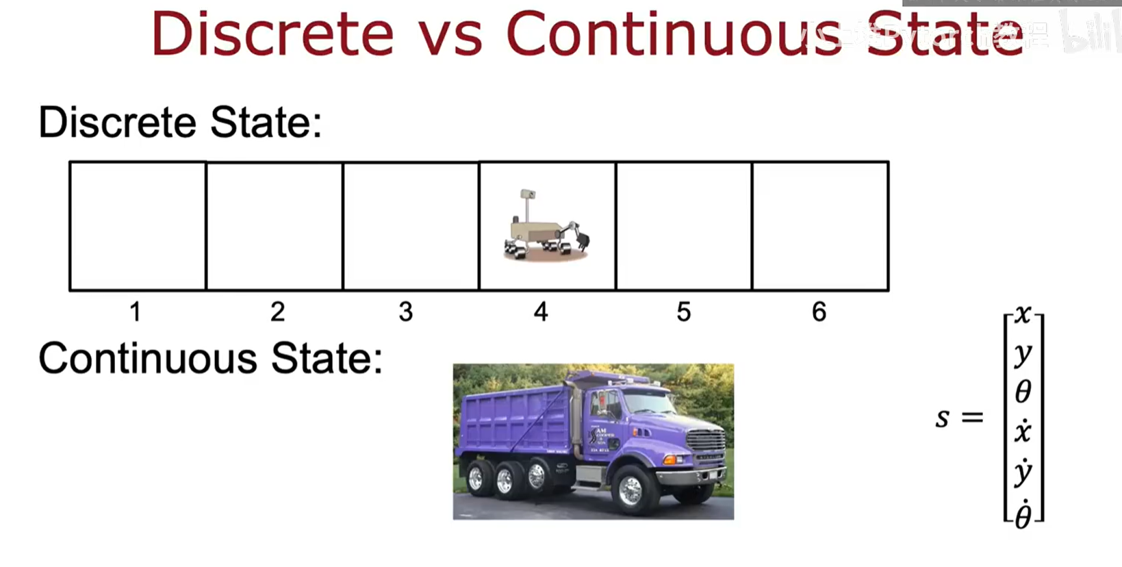 连续状态 (Continuous State) :状态由一组可以取任意实数值的变量来描述,因此理论上存在无限多个可能的状态。例如,要精确描述一辆卡车的状态