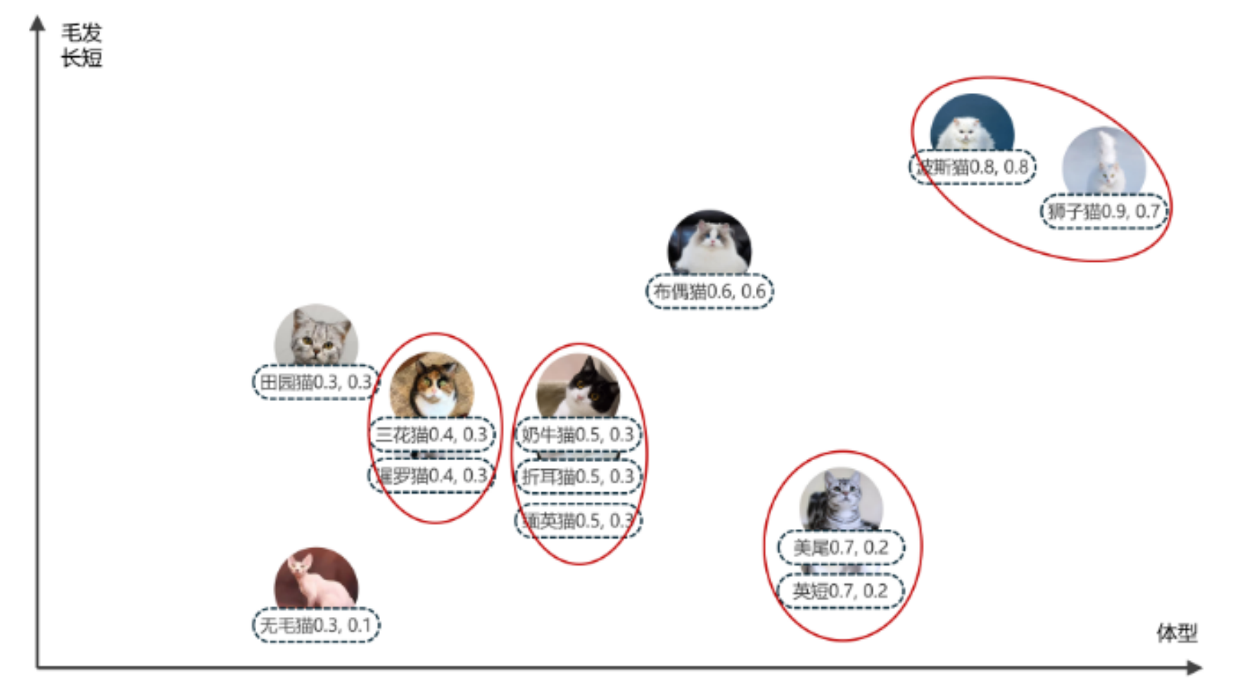 用前面的 猫猫向量 表示就是更接近,相似度更高,如下