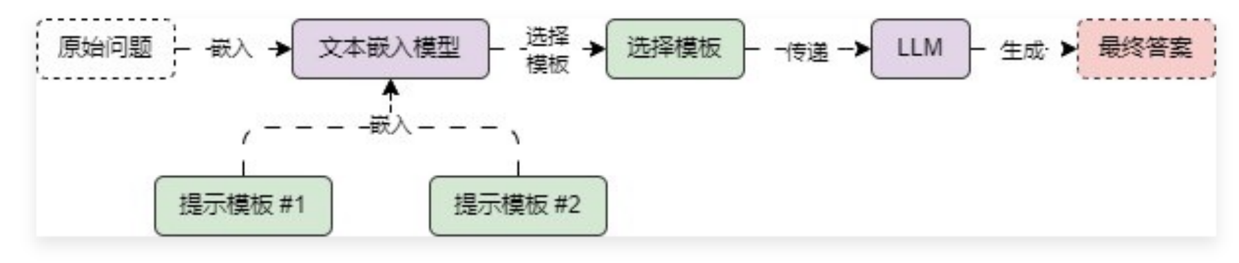 所以利用向量执行相似性搜索,不仅可以作用于 向量数据库,我们还可以利用 原始问题 与 prompt模板 的相似性,来找到类型、语义上更接近的模板,从而实现对 prompt模板 的动态路由。