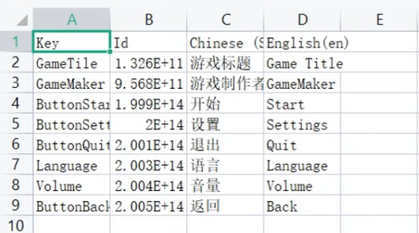 - Key-Value 词条表:Game.StartButton => "开始" / "Start" / "はじめる"