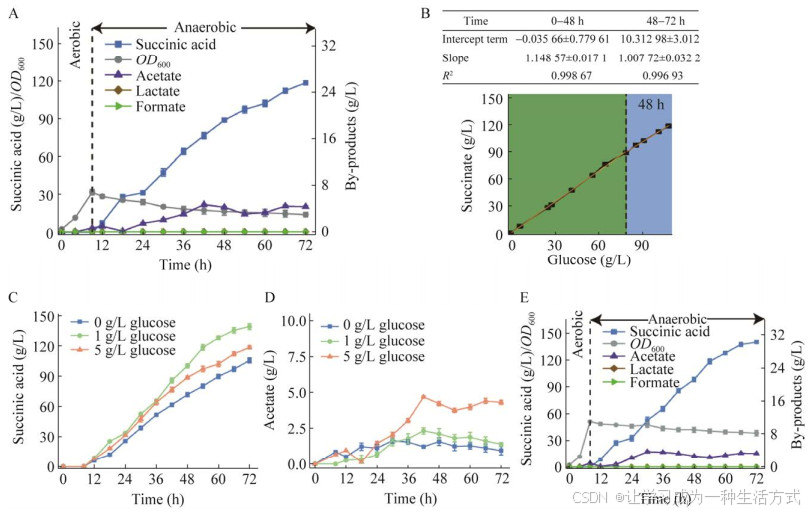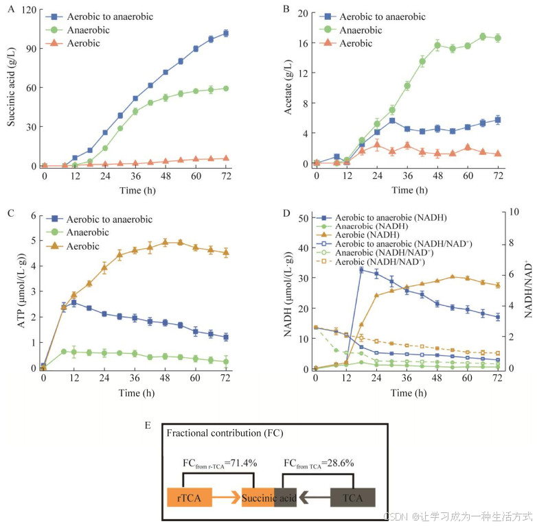 在有氧发酵、厌氧发酵和两阶段发酵3种不同条件下琥珀酸浓度(A)、乙酸浓度(B)、ATP浓度(C)和NADH浓度(D)变化曲线. E:大肠杆菌利用葡萄糖生产琥珀酸达到理想最大产率条件下的碳通量示意图