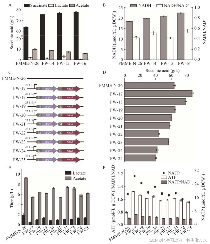 图 3 调节NADH平衡的菌株构建与评估Fig. 3 Construction and evaluation of strains in which the NADH balance is regulated.菌株E . coli FMME-N-26、FW-14、FW-15、FW-16发酵产酸情况(A)、NADH含量与NADH/NAD+比值(B). C:构建了一系列不同表达水平的gapA 和pncB 表达组合. gapA 和pncB不同表达组合的琥珀酸产量(D)、乙酸和乳酸浓度(E)、ATP含量、NADH含量和NADH/NAD+比值(F)