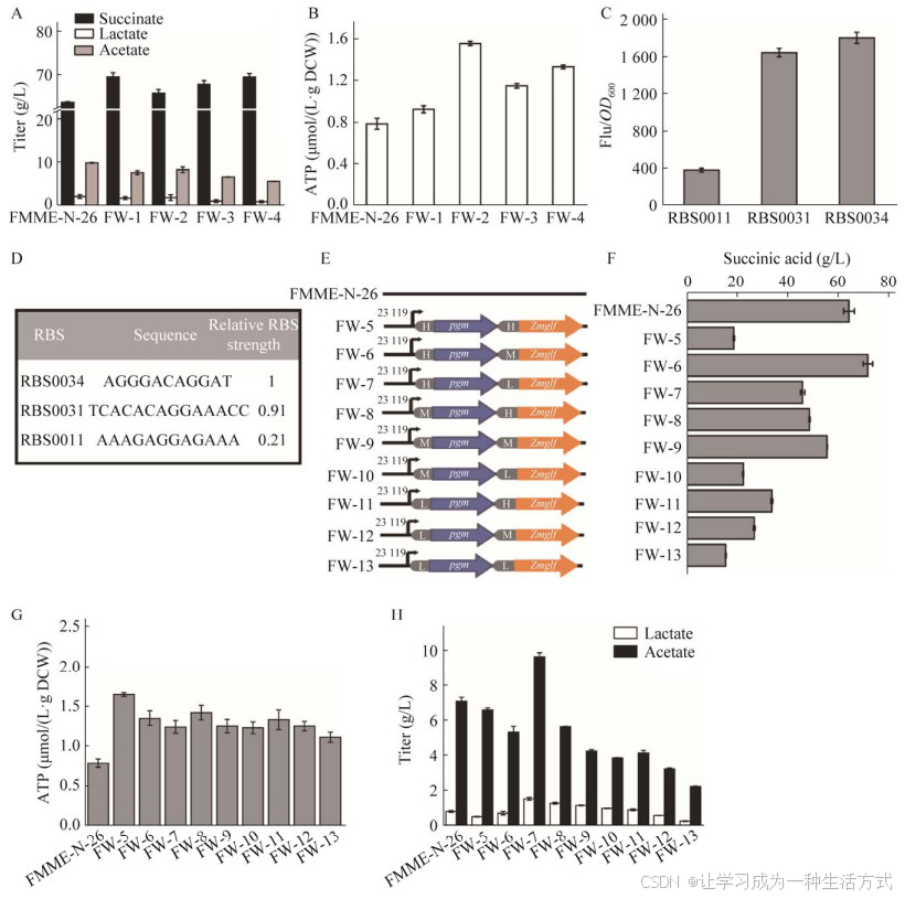 图 2 调节ATP平衡的菌株构建与评估Fig. 2 Construction and evaluation of strains regulating ATP balance.菌株E . coli FMME-N-26、FW-1、FW-2、FW-3、FW-4发酵产酸情况(A)和ATP含量(B). C:3种不同RBS的强度. D:3种不同RBS的序列情况与相对强度. E:不同表达水平的pgm 和Zmglf 表达组合. pgm 和Zmglf不同表达组合的琥珀酸产量(F)、ATP含量(G)、乙酸和乳酸浓度(H)