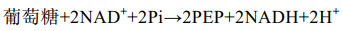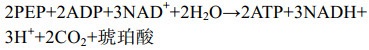 在5 L发酵上研究了不同氧气条件下E . coli FMME-N-26生产琥珀酸的情况,结果如图 1所示。有氧发酵罐发酵条件下,胞内ATP与NADH含量分别为4.52 μmol/(L·g DCW)和27.53 μmol/(L·g DCW),乙酸浓度为1.19 g/L,琥珀酸几乎不积累。厌氧发酵罐发酵条件下,ATP与NADH含量分别为0.24 μmol/(L·g DCW)和0.58 μmol/(L·g DCW),NADH/NAD+比值为0.22,琥珀酸产量为59.25 g/L,副产物乙酸浓度为16.62 g/L,比有氧条件提高了129.66%,可能与胞内ATP含量不足有关[20]。在两阶段发酵罐发酵条件下,胞内ATP与NADH含量分别为1.21 μmol/(L·g DCW)和17.08 μmol/(L·g DCW),NADH/NAD+比值为0.48,分别比厌氧条件提高了404.17%、2 844.83%、118.18%,此时琥珀酸产量为101.70 g/L,而乙酸浓度降为5.74 g/L。上述结果表明,菌株E . coli FMME-N-26高效生产琥珀酸的条件是微厌氧,且在生产过程中需要借助TCA循环为r-TCA途径提供一定量的NADH和ATP。为了研究胞内NADH和ATP含量如何影响菌株E . coli FMME-N-26生产琥珀酸,由式(1)计算得到大肠杆菌中葡萄糖经过糖酵解途径生成磷酸烯醇式丙酮酸(PEP)的过程可生成2 mol NADH。结合公式(1)+(2)得公式(3),发现有氧条件下1 mol葡萄糖可生成1 mol琥珀酸,产生5 mol NADH和2 mol ATP;结合公式(1)+(4)得公式(5),发现厌氧条件下,大肠杆菌中PEP可直接经r-TCA循环生成琥珀酸,也即1 mol葡萄糖可生成2 mol琥珀酸,但需要补充2 mol NADH,且无ATP生成。通过调节大肠杆菌的PP途径与糖酵解途径的碳通量比和激活乙醛酸循环使得71.4%的碳流向r-TCA途径,28.6%碳流向TCA循环,从而获得最大产率1.714 mol/mol [9, 21-22] (图 1E)。通过(3)×0.286+(5)×0.714得公式(6),从而得到葡萄糖转化为琥珀酸不需要额外的NADH,并有额外ATP生成来维持细胞代谢,避免生产琥珀酸过程中NADH与ATP不足的问题。表明部分碳流向TCA循环以生成能量与辅因子,从而缓解因能量与辅因子不足而导致r-TCA合成琥珀酸能力下降的瓶颈。