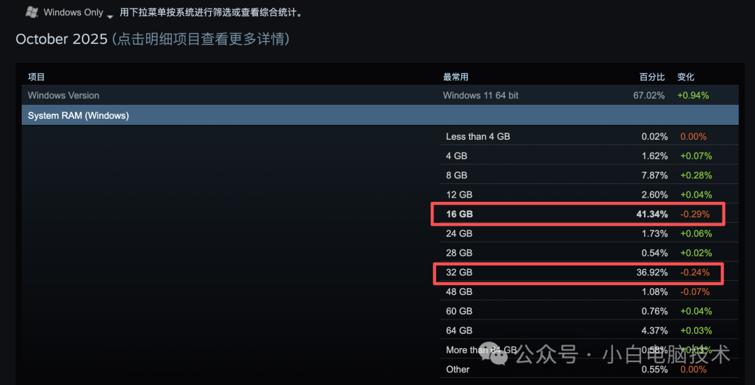 在统计项目中,可以看到4GB和8GB用户几乎已经很少了,大概就10%。