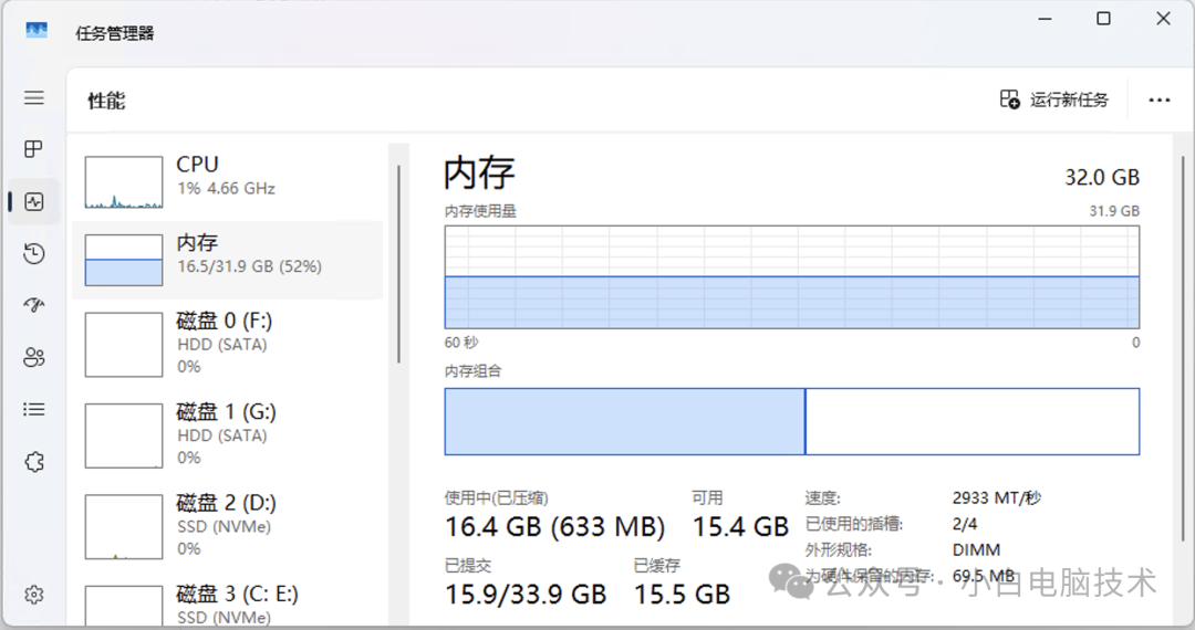 4GB的情况下,(Win10)电脑开机之后,运行个微信,再打开个浏览器,内存基本上就满了,如果再打开其他软件,电脑就会调用虚拟内存,然后就会感觉卡顿......