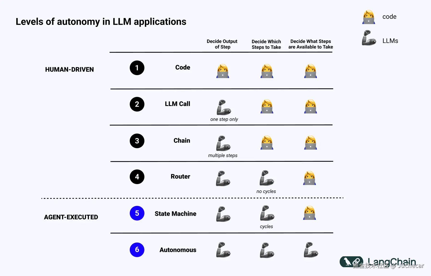 在此之前,你事先知道应用的所有执行步骤。而到了这一阶段,你不再预先确定流程------LLM 会动态决定采取哪些行动。这引入了更多随机性和不可预测性。