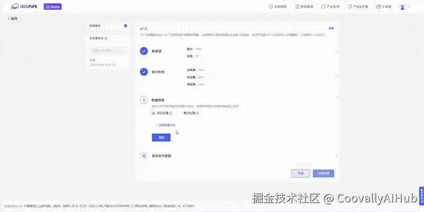 Coovally平台还提供强大的数据增强功能,可以自由应用多样化的数据增强功能(如旋转、翻转、色彩调整、噪声添加等) ,有效扩充训练数据,从而显著提升模型的泛化能力、鲁棒性并降低过拟合风险,用户可通过直观配置轻松实现。