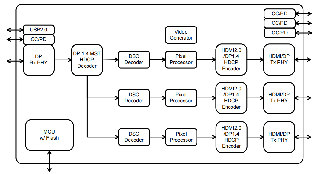- 支持 HBR3 32.4Gbps 带宽 (4 通道),可接收单个 DP 1.4 信号并拆分为 3 路独立视频流 ,每路支持 4K@60Hz(DSC 压缩) 或 2K@144Hz(非压缩)。