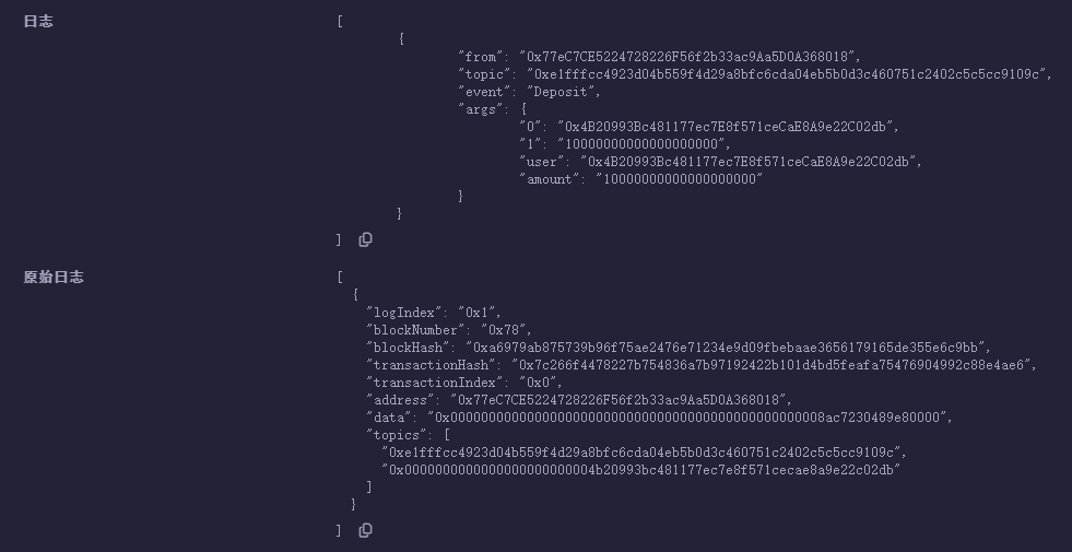 event Deposit(address indexed user, uint256 amount);事件被触发后的交易回执: