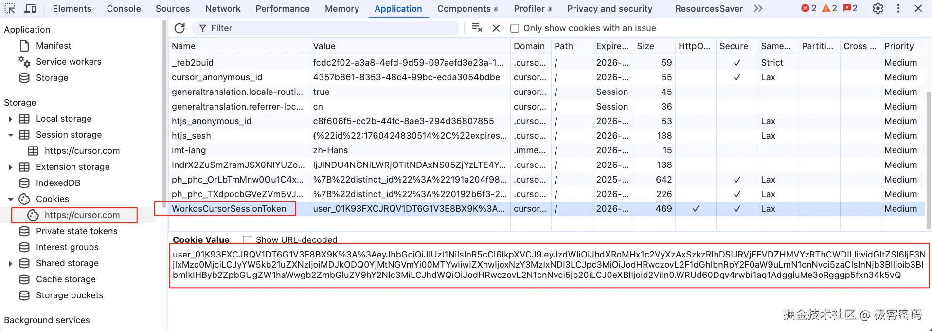 回到 Cursor 网页端,打开控制台,切换到 Application,找到 Cookies 中的 WorkosCursorSessionToken 并复制并粘贴过来