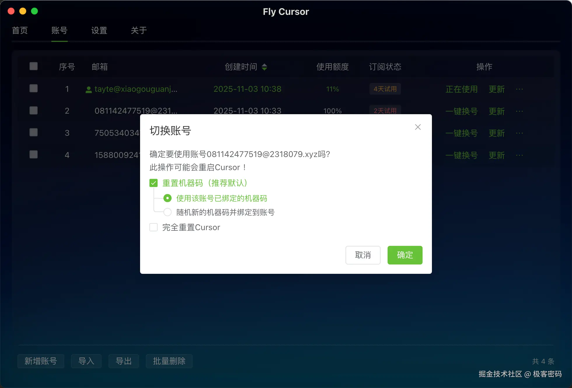 如果你有两个或两个以上的账号在软件内,点击 一键换号 即可自动重置 Cursor 机器码,自动重启编辑器,并将账号自动切换至你当前所选的账号
