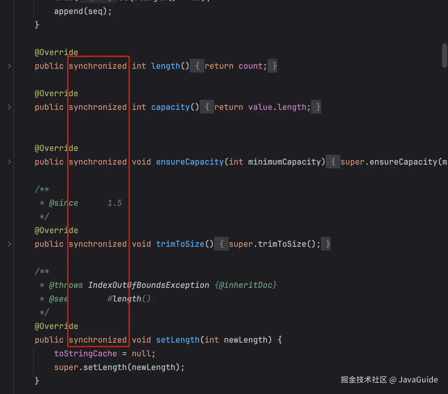 StringBuffer 的线程安全是通过在它的大部分公开方法(如 length、 append、insert)上添加了synchronized关键字来实现的。
