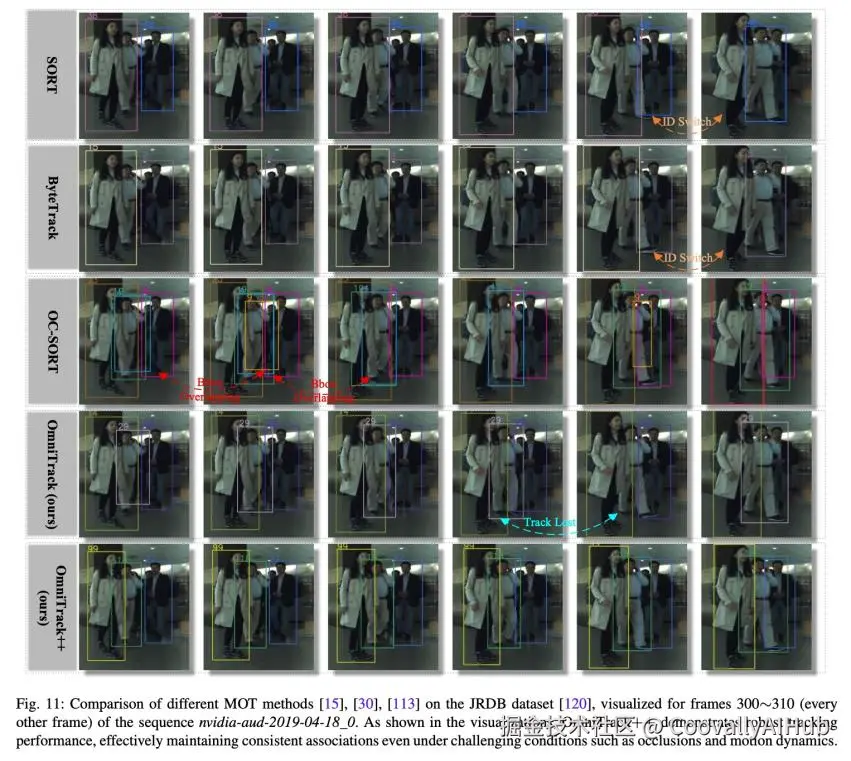 即使在JRDB数据集上的复杂场景中,面对遮挡和动态变化,OmniTrack++也能保持稳定的跟踪性能,明显优于其他方法。