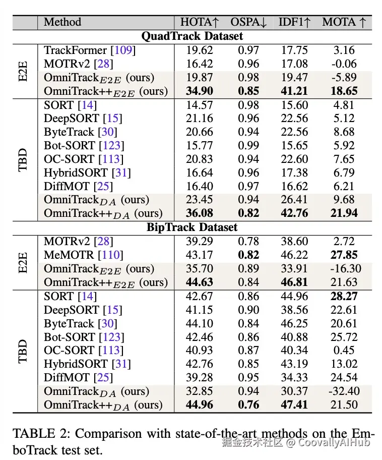 - 在BipTrack数据集上,OmniTrack++E2E与OmniTrack++DA分别取得44.63与44.96的HOTA分数,持续优于所有对比方法