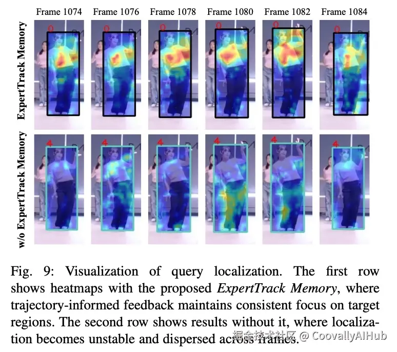 定性结果同样令人信服。对比实验显示,在轨迹反馈的帮助下,模型的注意力能持续稳定地聚焦在目标上;而没有该模块时,定位则变得极不稳定。