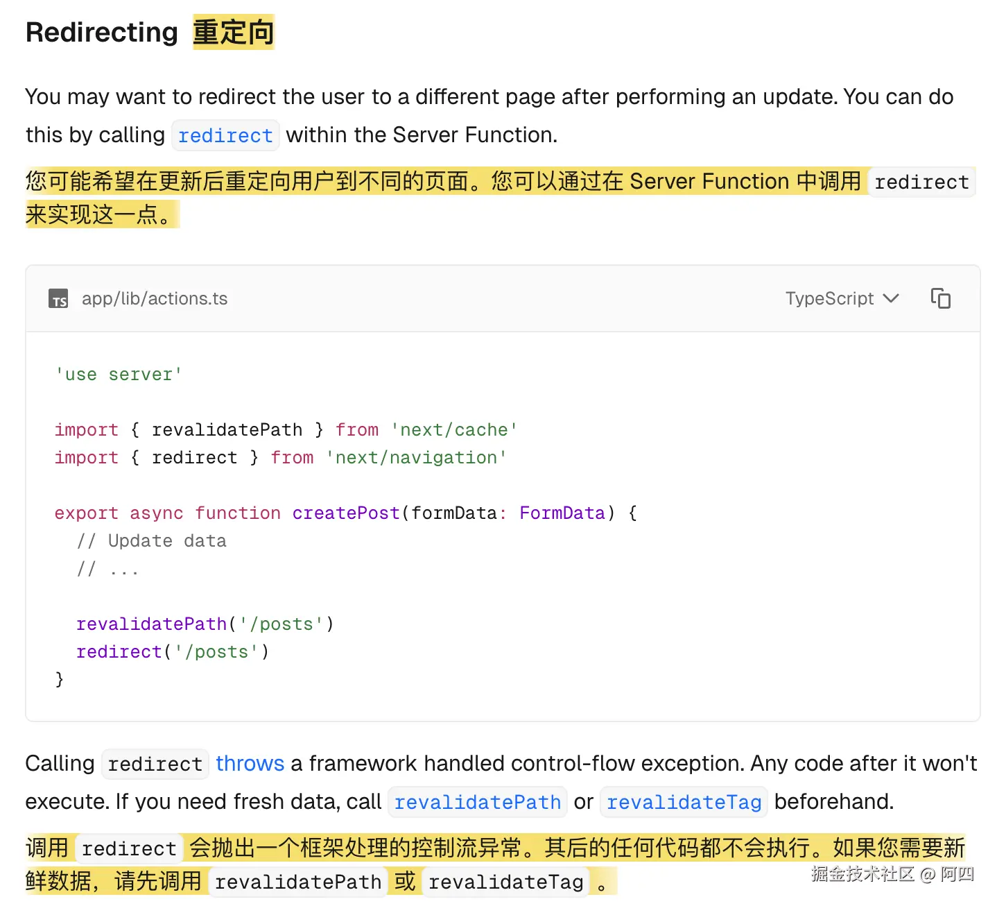 执行到redirect() 这行代码之后,将会抛出一个特别的异常(NEXT_REDIRECT 异常),抛出后 Next 框架会捕获到它,然后执行对应的跳转逻辑,很奇特的执行方式,Next实现 redirect 的方式就是这么骚。