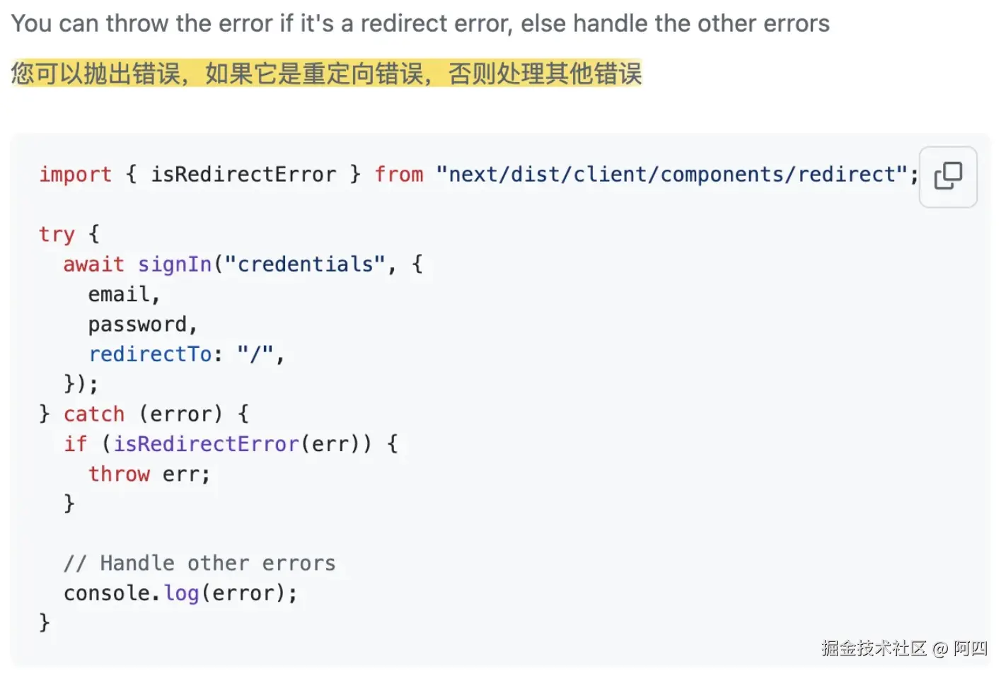 说的对,所以我们可以使用 nextjs 库中的一个函数(isRedirectError),将 redirect 的异常过滤出来,如果是它,就放行,直接从 catch{} 抛出去,如果不是,就拦的死死的