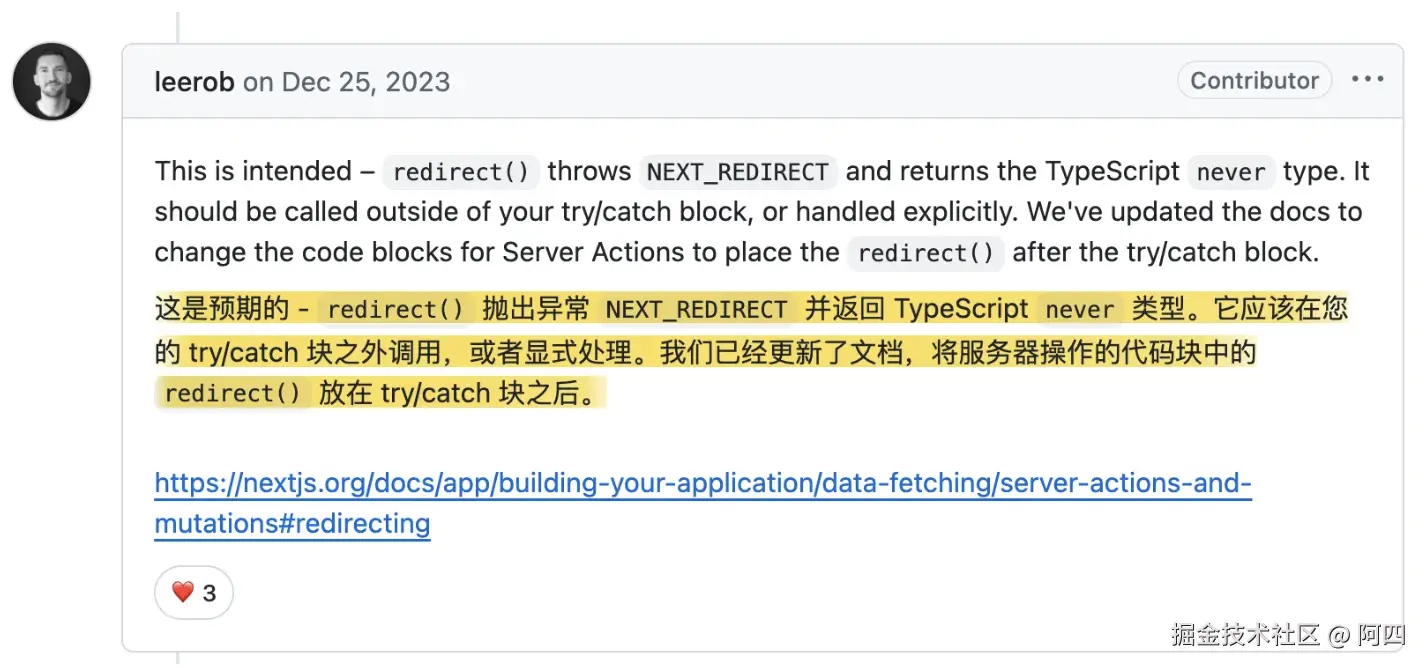 ❗️ 这是Nextjs官方有意而为之的 ,redirect能够进行跳转操作的底层原理是: